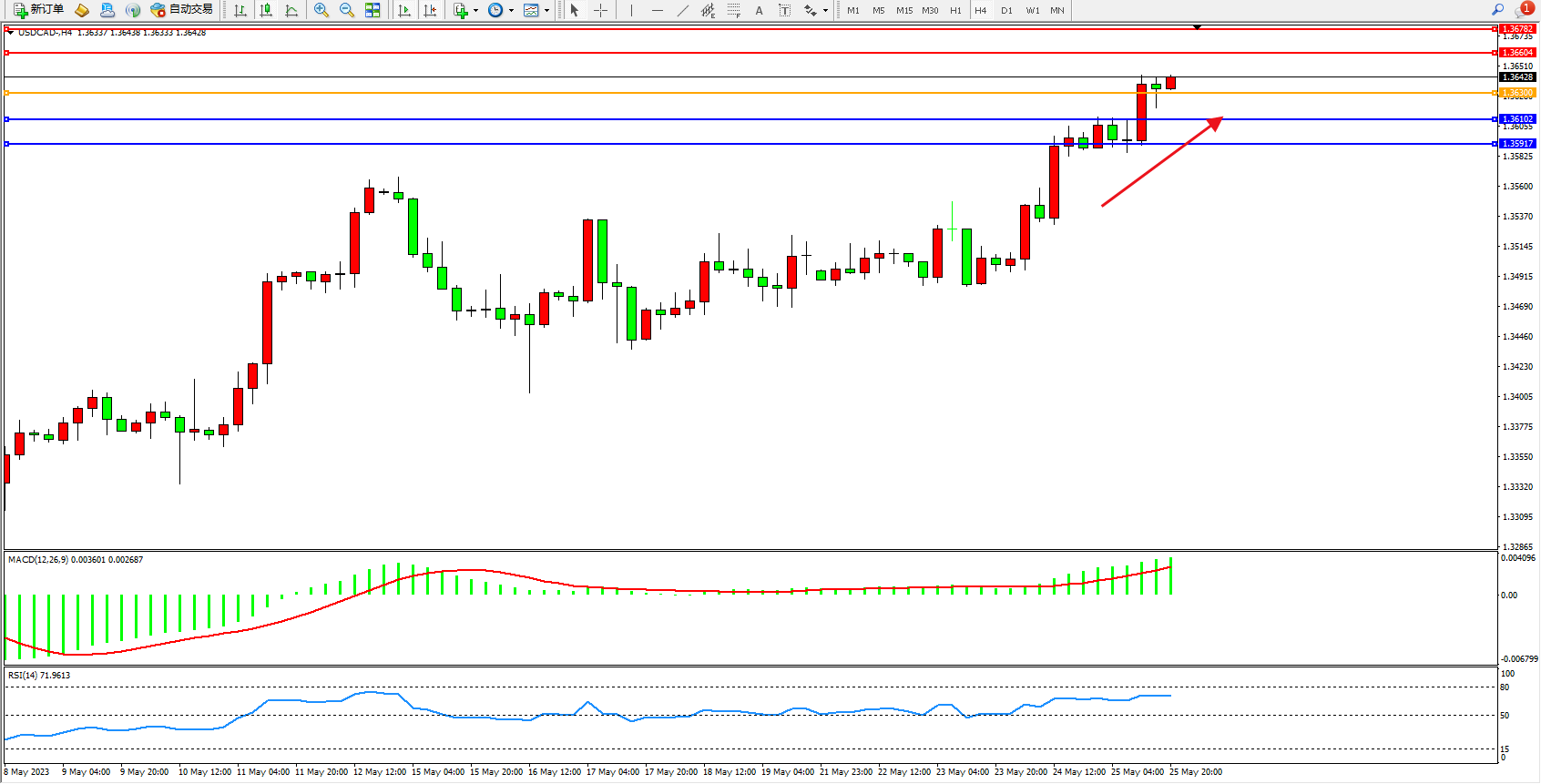 美元加元USDCAD——4小时K线图显示: