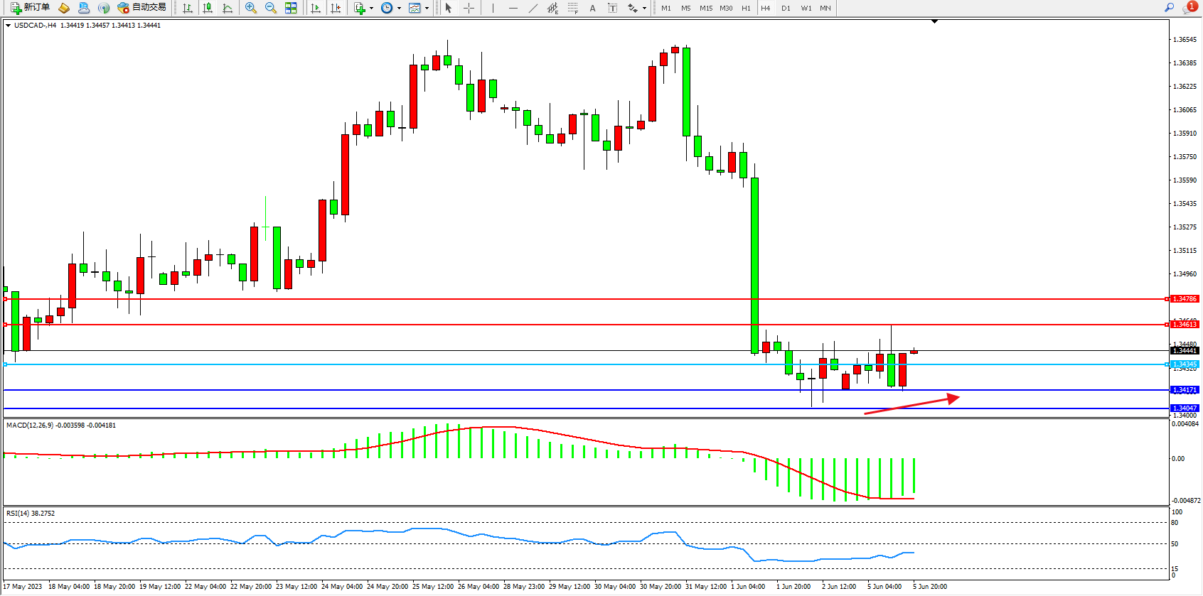 美元加元USDCAD——4小时K线图显示:
