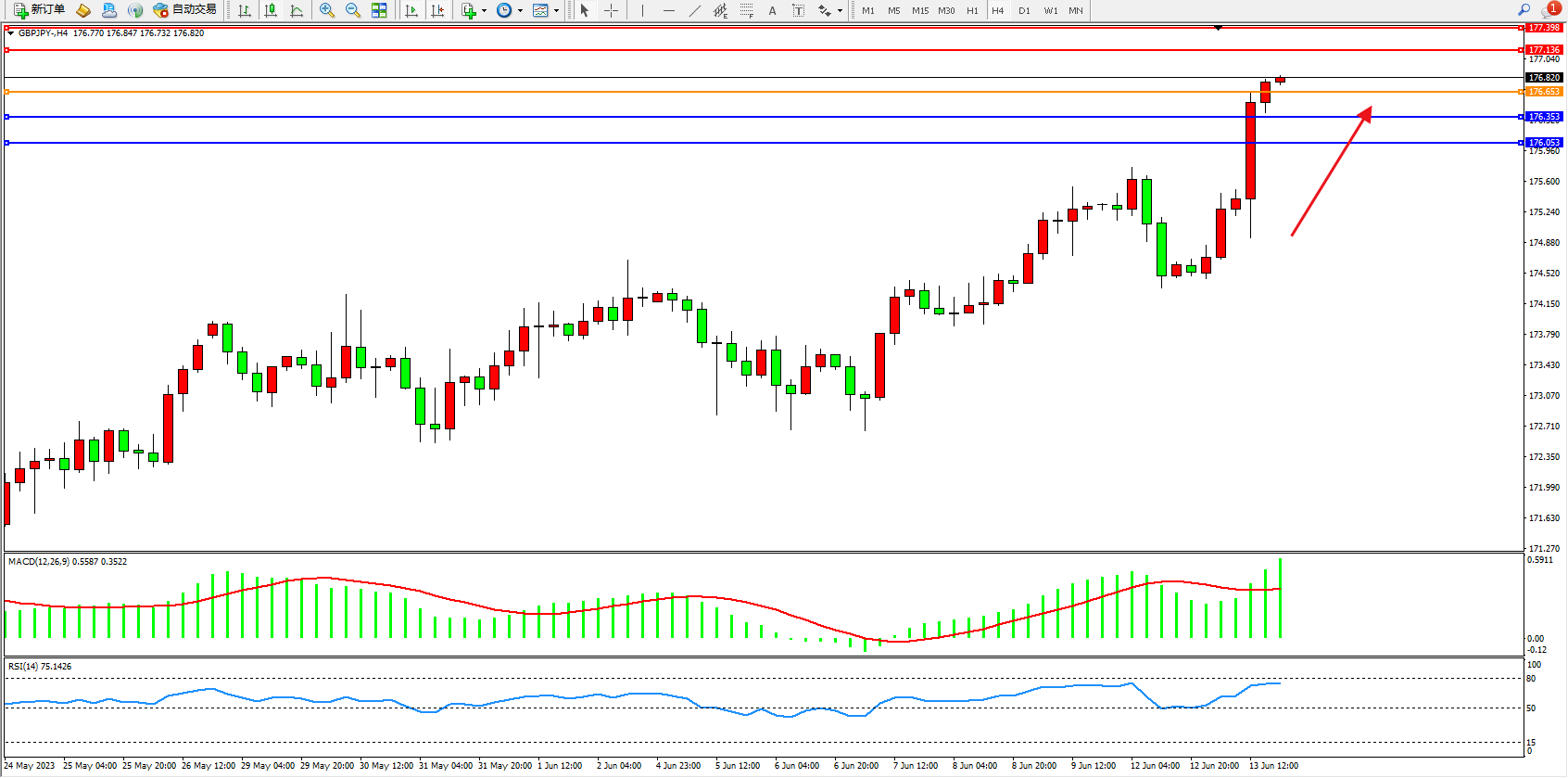 4小时图看:多头动力高位强势拉升,市场看涨情绪持续,短期多头有继续向上移动迹象,MACD指标处于多头区域高位上扬,RSI指标处于多头区域高位上移;