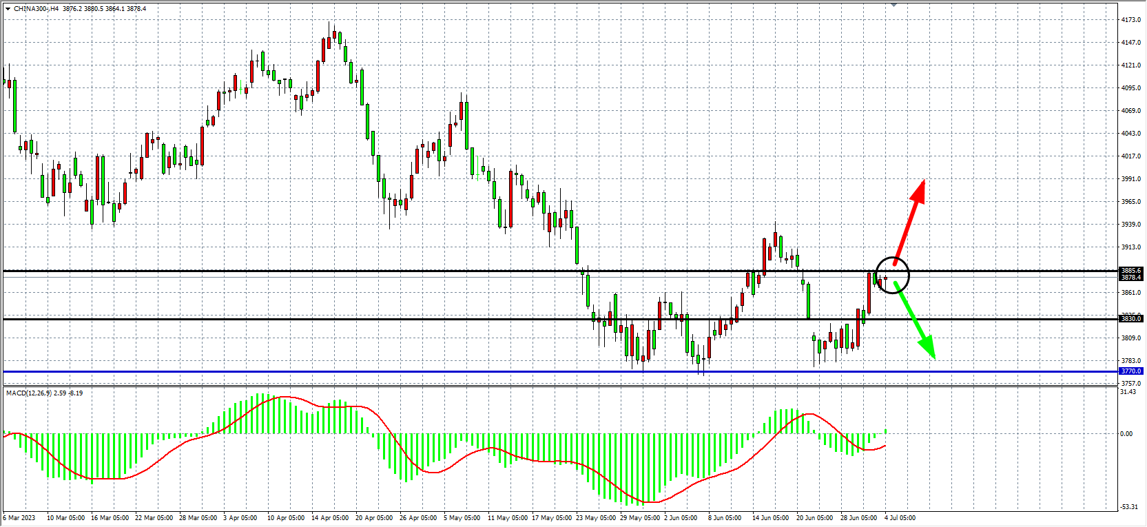 4小时图看,沪深300在3反弹3885附近再度受阻明显,MACD量能开始上穿零轴,反弹趋势延续,重点关注3885得失,下方支撑关注3830。