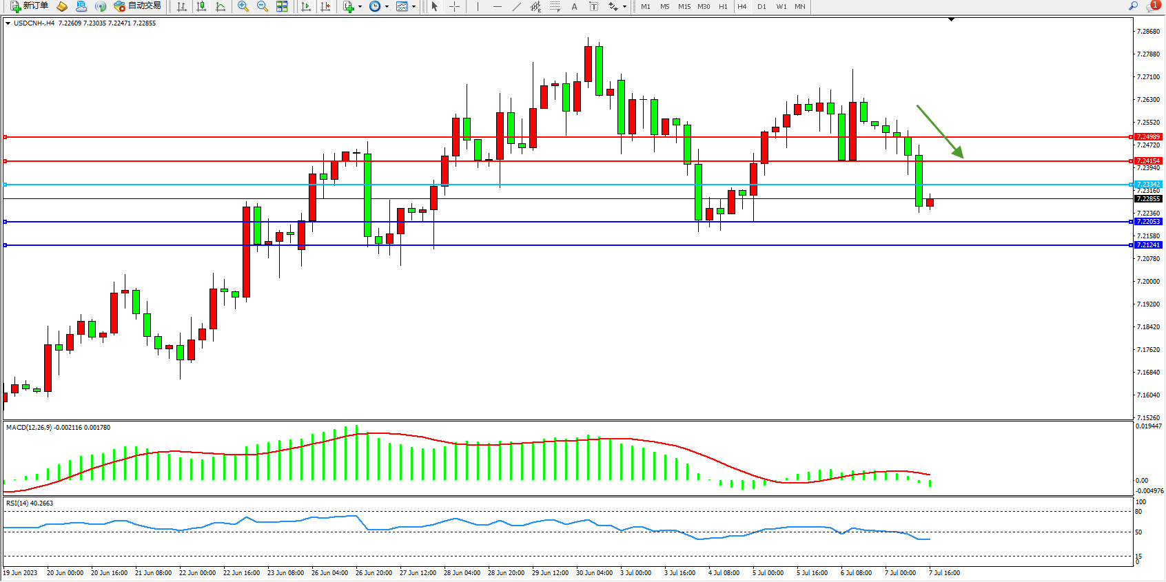 交易策略:7.23242下方看跌,目标7.22053 7.21241