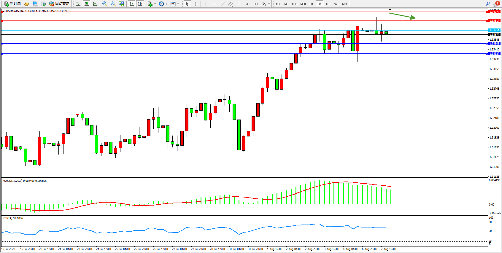 美元加元USDCAD——4小时K线图显示: