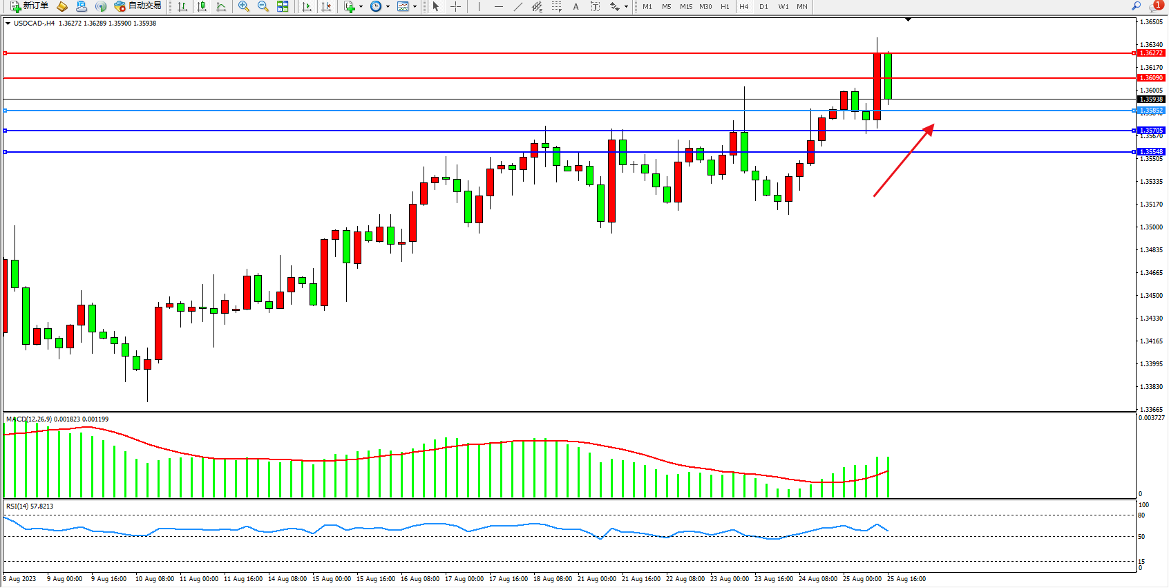 美元加元USDCAD——4小时K线图显示: