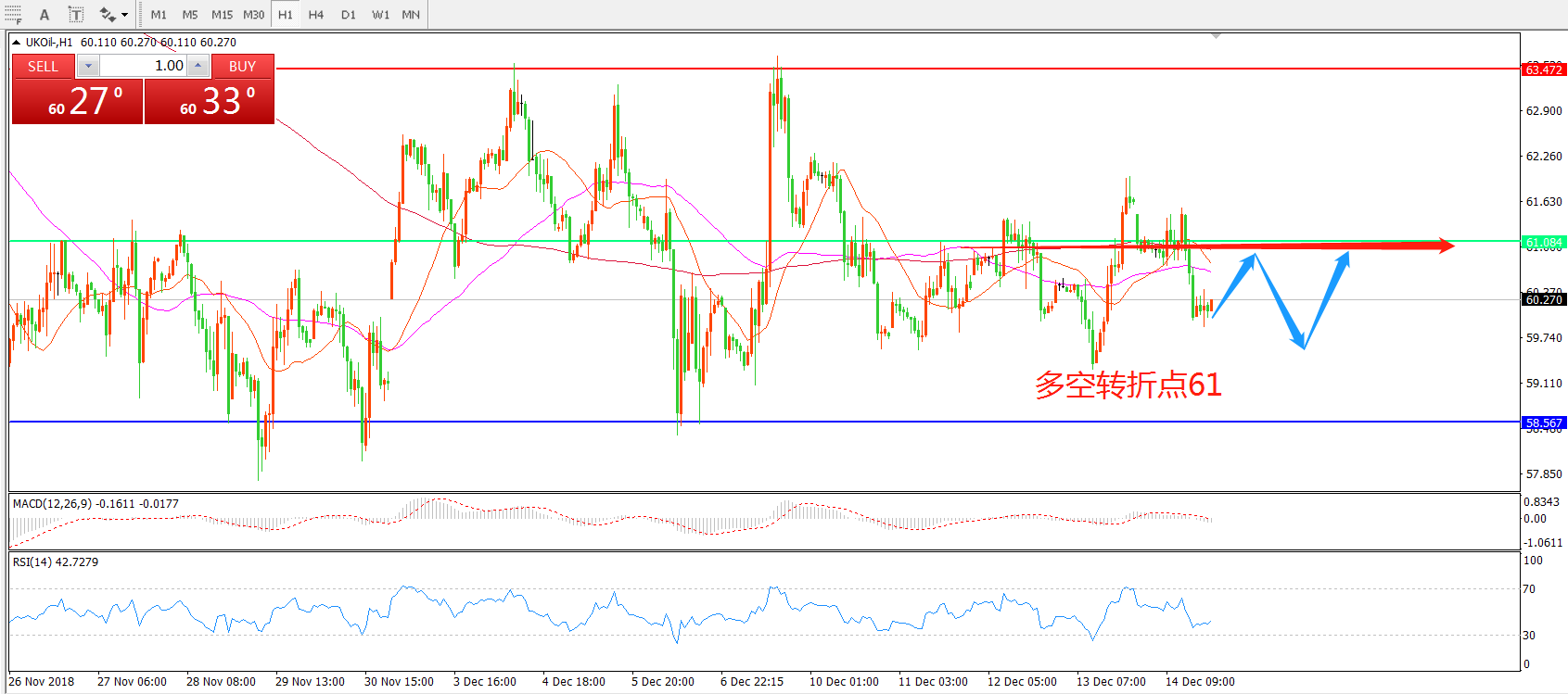 交易策略:在61.00之下看跌,目标58.00 55.00