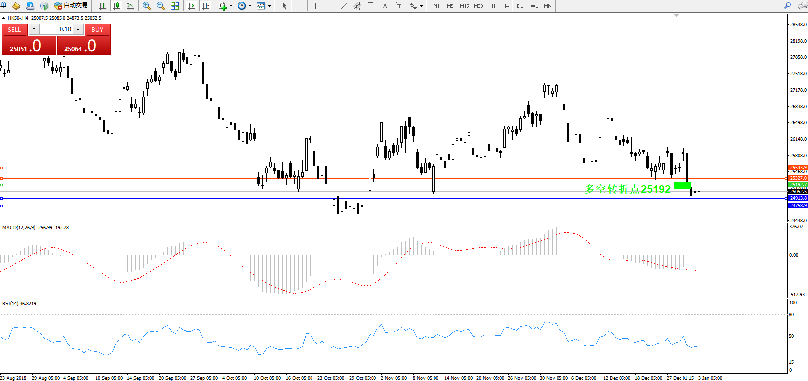 恒指HK50 ——4小时K线图显示: