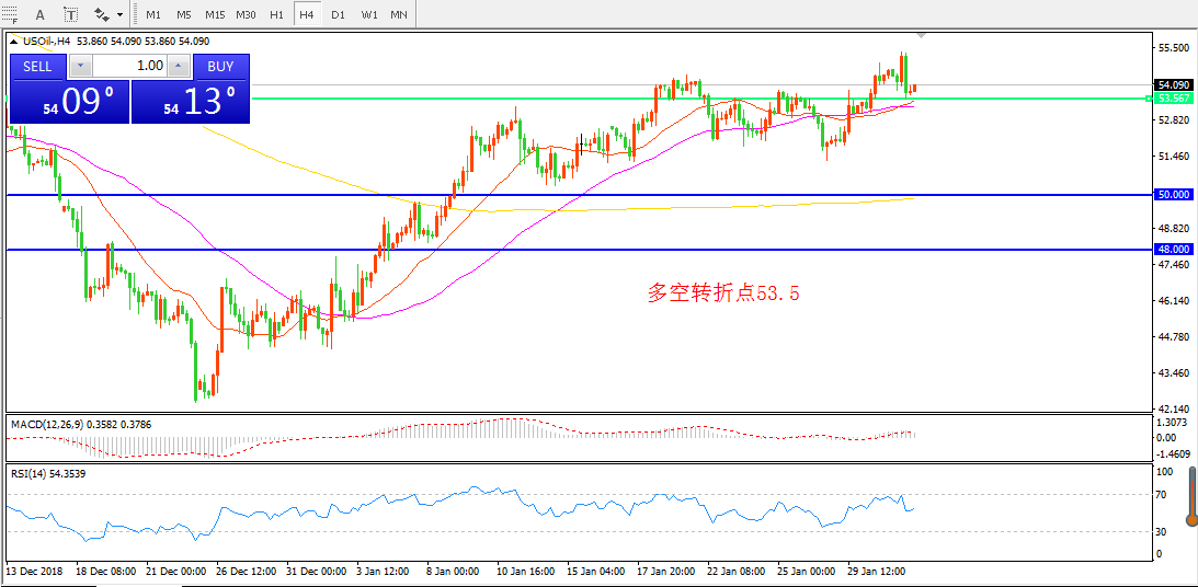 4小时图看,油价在52-54美元整理后, 昨日强势突破后中阴线回落,整体价格依然在支撑之上。均线系统逐渐走平, MACD红柱减少,预计区间震荡仍将继续。