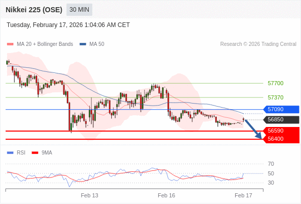 交易策略: 在 57090 之下,看跌,目标价位为 56590 ,然后为 56400 。