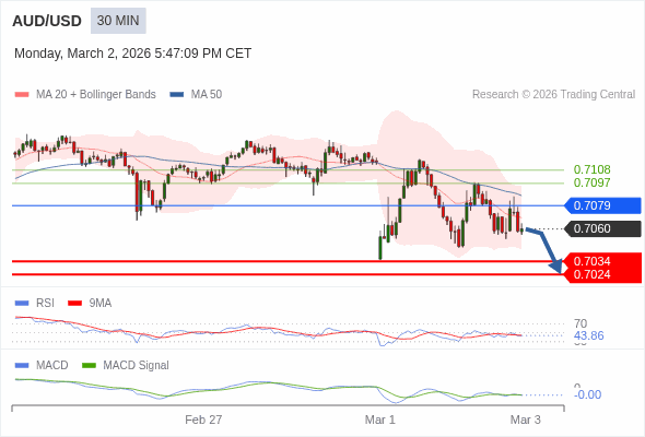澳元/美元 当日内 : 看跌,在 0.7079 之下。