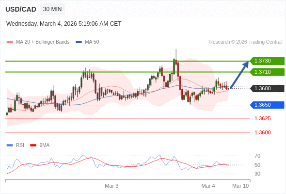 在 1.3650 之上,看涨,目标价位为 1.3710 ,然后为 1.3730 。