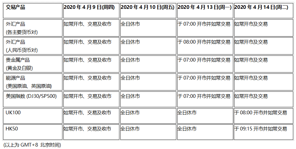 因应2020年4月10日(周五)为欧美市场耶稣受难日假期,2019年4月13日(周一)为亚欧市场复活节假期;以下交易产品的交易时间将于假期期间休市,敬请留意知悉!