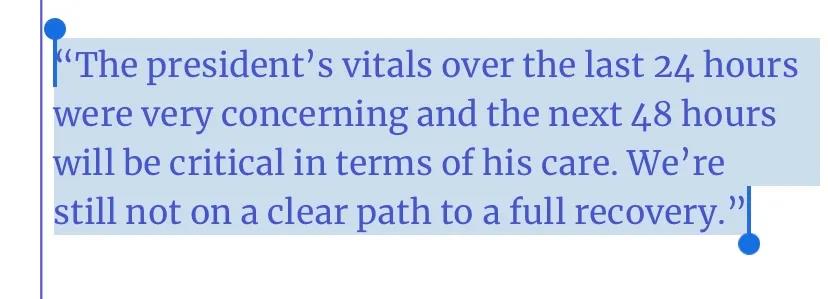 在特朗普住院后的第二天,特朗普的医生康利携同9名医生在媒体面前亮相,他声称特朗普的情况非常好,没有上吸氧机,也没有呼吸困难,而与康利的记者会形成鲜明对比的是,白宫幕僚长梅多斯私下是这样告诉记者特朗普病情的:“总统过去24小时的各项指标令人非常担忧,接下来的48小时对于他的治疗至关重要。”