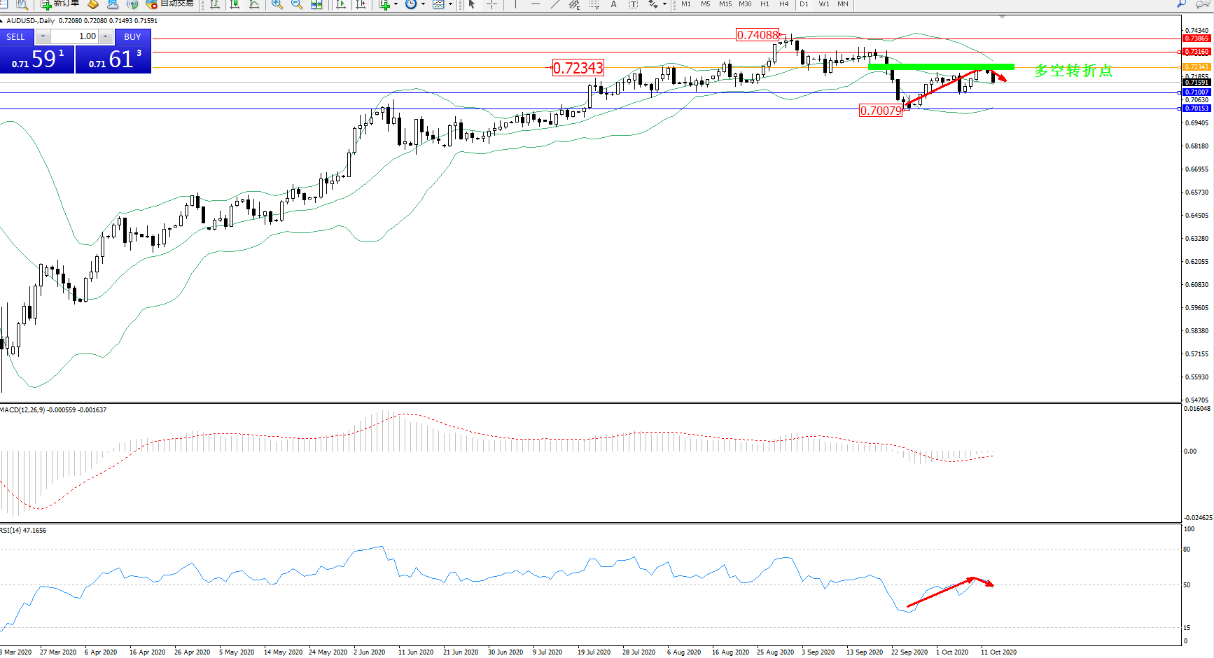 交易策略:0.72343下方看跌,目标0.71007、0.70153