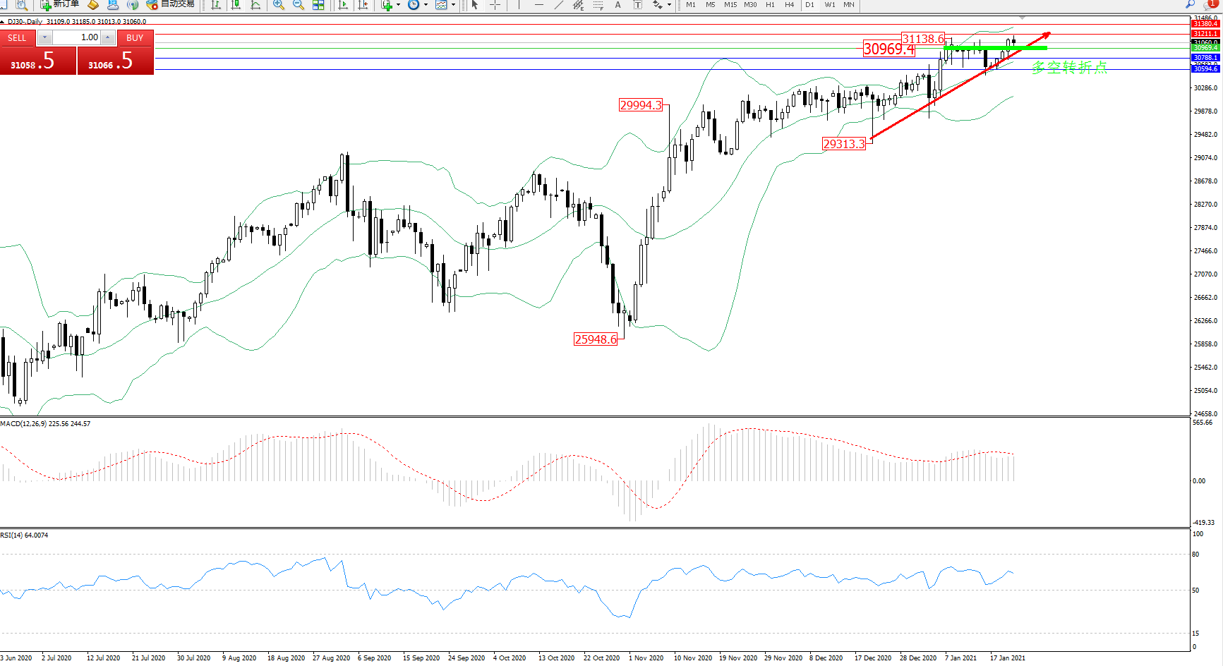 交易策略:30969上方看涨,目标31211、31380
