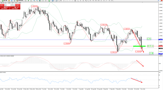 空头动力高位急速震荡下挫,低位跌破布林带指标下轨1.34242位置节点后有继续下行态势,布林带指标呈收口走势持续中,上方压制关注1.36378位置,低位支撑关注1.33801位置,关注1.35204附近转折点,MACD指标空头动力持续震荡下挫破0轴线进入空头区域下行,RSI指标处于50均衡线下方维持整理向下移动中,如图:
