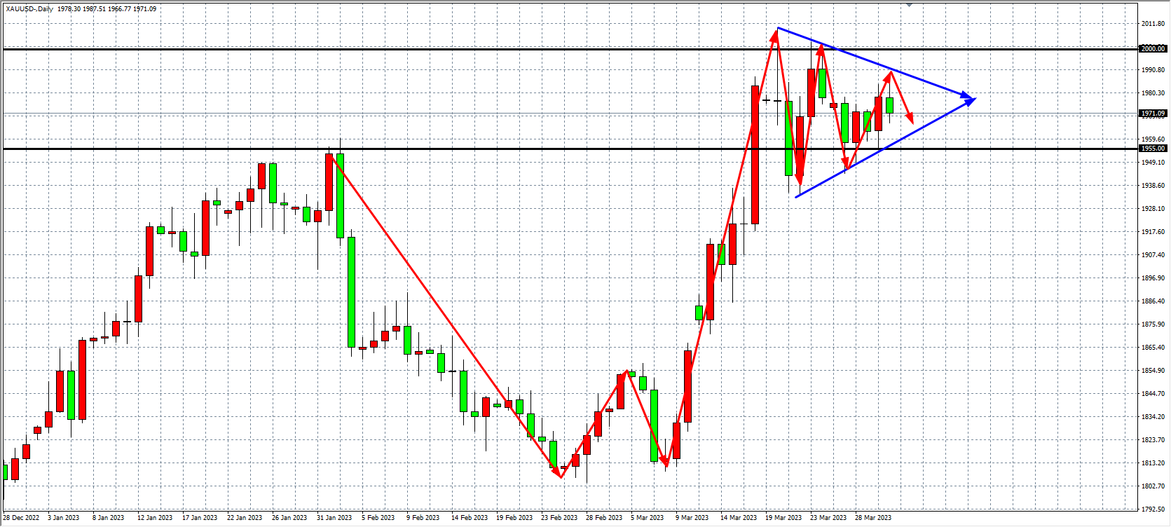 从日线图看,金价从1800关口之上开启涨势以来,突破了前高点1955一线后维持高位整理,同时在2000点一线出现明显受阻,形态上形成对称三角形整理。从走势结构上看,当前的三角形整理主要是对于前一波强势上涨的修正,随着后期三角形突破,也即将出现新的方向选择。往上若破位2000美元,后期目标看至2020-2050附近,若向下跌破1955支撑,则目标看1930-1910附近。