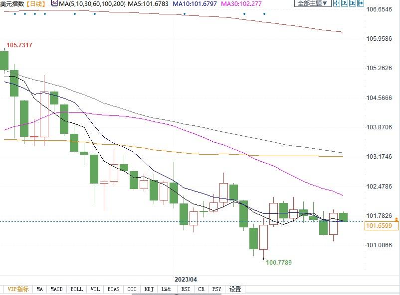 美元指数(101.4431, 0.0053, 0.01%)日线图北京时间4月26日14:52,美元指数报101.66。