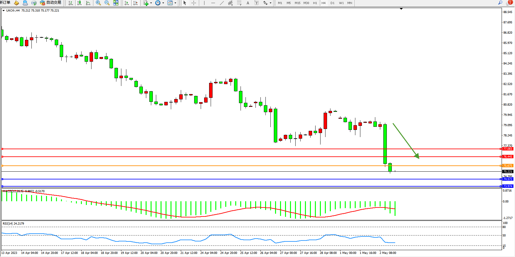 交易策略:75.675下方看跌,目标74.572  73.971