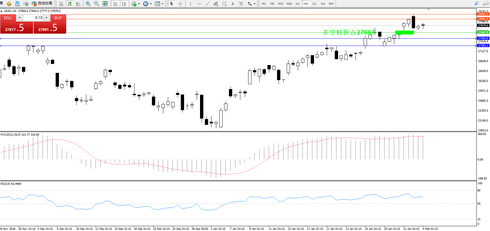 恒指HK50 ——4小时K线图显示: